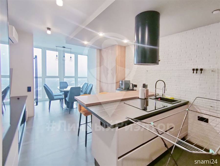 Современный дизайнерский ремонт выполнен с использованием качественных материалов, которые создают атмосферу уюта и комфорта. Большие панорамные окна на кухне наполняют пространство естественным светом и дарят приятные виды.