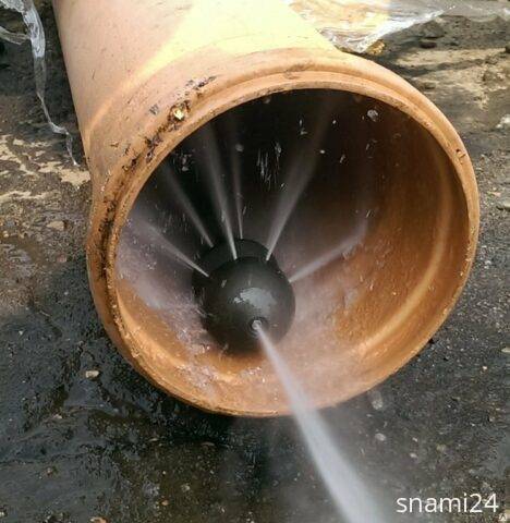 Гидродинамическая прочистка канализации – это механическая обработка внутренней полости труб струей воды под высоким давлением (обычно в интервале 100-200 атмосфер). Под сильным напором поверхность ошкуривается, как если бы вы работали щеткой. Труба, полностью освобожденная от осадка, обладает свойством самоочистки, как новая. После промывки налет на стенках образуется нескоро. Принцип действия гидродинамической машины: рабочий орган с насадкой помещают в начало участка, который предстоит прочистить. Включают компрессор. От компрессора по шлангу под давлением поступает мощная струя воды, которая проталкивает шланг с насадкой по трубе и разбивает осадок. В процессе промывки человеку остается только контролировать положение шланга и при необх