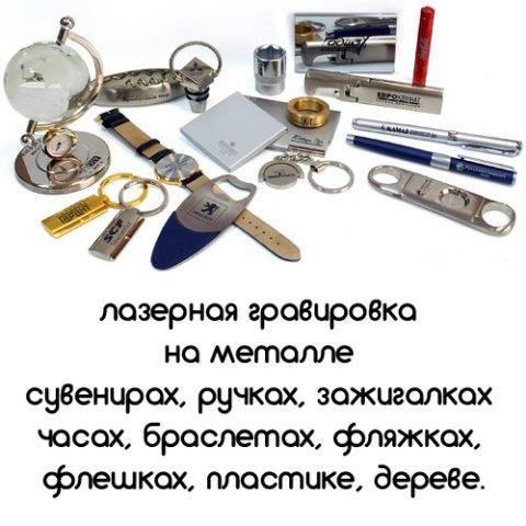 Гравировка на металлических и деревянных сувенирах, ручках, зажигалках, часах, браслетах, термосах, фляжках, флешках, на дереве, коже, акриле, пластике, камне.