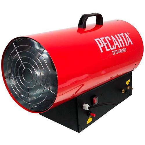 Газовая тепловая пушка РЕСАНТА ТГП-50000 – воздухонагреватель, работающий на сжиженном газовом топливе. Топливо необходимо для получения горячей атмосферы в камере сгорания, а электроэнергия, подводимая к устройству, необходима для питания вентилятора, нагнетающего воздух, и для функционирования автоматики. Газовые пушки прямого нагрева являются простой и надёжной конструкцией без дымохода, где горячий воздух из устройства поступают в помещение.